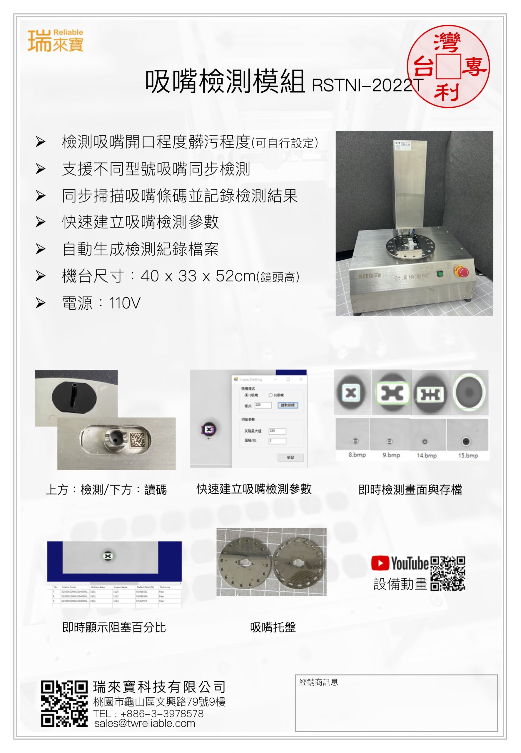 瑞來寶自行開發、100%台灣製造之吸嘴檢測機,已經正式取得智慧財產局之核可並取得案號 ; 另案背光檢測專利正在審核中,相關視覺檢測歡迎洽詢討論 ; 03-3978578, sales@twreliable.com
